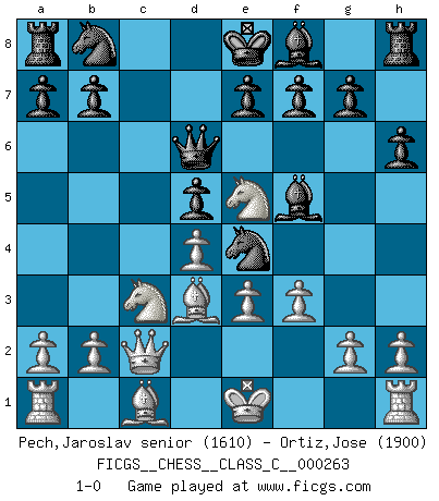 Last move : 1-0 2019 March 9 22:34:48 [Event "FICGS__CHESS__CLASS_C__000263"] [Site "FICGS"] [Date "2018.11.10"] [Round "1"] [White "Pech,Jaroslav senior"] [Black "Ortiz,Jose"] [Result "1-0"] [WhiteElo "1610"] [BlackElo "1900"] 1.d4 Nf6 2.c4 d5 3.Nc3 c6 4.Nf3 h6 5.e3 Ne4 6.Bd3 Bf5 7.Qc2 Qd7 8.cxd5 cxd5 9.Ne5 Qd6 10.f3 1-0 This chess game has been lost on time (started : 2018.11.10 14:54:38) Queen's pawn game Player White won this chess game. Follow this game move after move (download)I believe that Chess possesses a magic that is also a help in advanced age. A rheumatic knee is forgotten during a game of Chess and other events can seem quite unimportant in comparison with a catastrophe on the chessboard. (Vlastimil Hort) Ivan Sokolov treibt mich als Beifahrer an mit go Loeky go - . (Loek van Wely) El muchacho (en ese entonces un niño de 12 años llamado Anatoly Karpov) no tiene ni idea de lo que es el Ajedrez y no hay futuro en absoluto para el en esta profesión. (Mikhail Botvinnik) C'est la seule position que je connaisse où les deux camps sont mals. Propos prêtés à V. Anand. To steal ideas from one person is plagiarism. To steal from many is research. (Unknown)