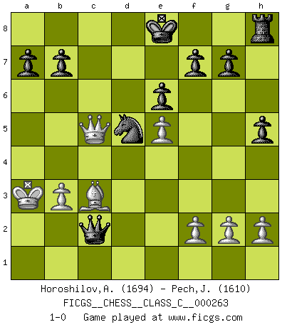 Last move : 1-0 2019 May 10 7:59:10 [Event "FICGS__CHESS__CLASS_C__000263"] [Site "FICGS"] [Date "2018.11.10"] [Round "1"] [White "Horoshilov,Andrey"] [Black "Pech,Jaroslav senior"] [Result "1-0"] [WhiteElo "1694"] [BlackElo "1610"] 1.e4 c6 2.d4 d5 3.e5 Bf5 4.Nf3 e6 5.Bd3 Bxd3 6.Qxd3 Nd7 7.Nbd2 c5 8.b3 cxd4 9.Qxd4 Bc5 10.Qg4 Ne7 11.Bb2 h5 12.Qh3 Rc8 13.c4 dxc4 14.Nxc4 Bb4+ 15.Nfd2 Bxd2+ 16.Nxd2 Nc5 17.O-O-O Nxb3+ 18.Kb1 Nxd2+ 19.Ka1 Rc5 20.Qe3 Rd5 21.Bc3 Nb3+ 22.axb3 Rxd1+ 23.Rxd1 Qxd1+ 24.Ka2 Nd5 25.Qc5 Qc2+ 26.Ka3 1-0 This chess game has been lost on time (started : 2018.11.10 14:54:38) Caro-Kann : Advance variation Queenside Castling by player White (move 17) Player White won this chess game. Follow this game move after move (download)In Chess, at least, the brave inherit the earth. (Edmar Mednis) Man gibt nur Pakete auf. (Paul Keres) Botvinnik trataba de restarle el misterio al Ajedrez, siempre relacionandolo a situaciones de la vida ordinaria. El gustaba de llamar al Ajedrez un típico problema inexacto similar a aquellos de los cuales la gente siempre tiene que enfrentarse en la vida cotidiana. (Garry Kasparov) Les Echecs, c'est l'art de la guerre sans les charniers, c'est la résurrection des morts tombés au champ d'honneur, l'espoir perpétuel, la suprématie de l'intelligence sur la force, la culture de l'esprit. (F. Szpiner) A good player is always lucky. (Capablanca)