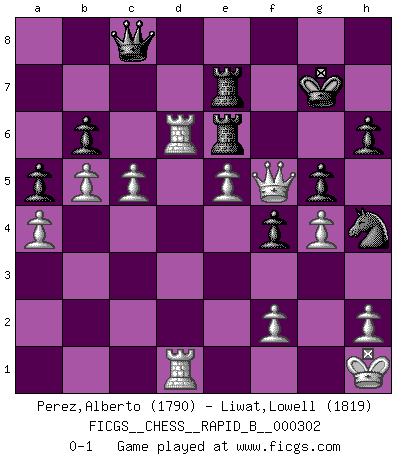 Last move : 0-1 2019 January 8 2:17:41 [Event "FICGS__CHESS__RAPID_B__000302"] [Site "FICGS"] [Date "2018.11.12"] [Round "1"] [White "Perez,Alberto"] [Black "Liwat,Lowell"] [Result "0-1"] [WhiteElo "1790"] [BlackElo "1819"] 1.b4 a5 2.b5 c5 3.a4 d5 4.d4 cxd4 5.Qxd4 b6 6.Bb2 Bb7 7.g3 f6 8.Bg2 e5 9.Qd3 Bc5 10.c4 Ne7 11.Nd2 Ra7 12.Rd1 d4 13.Bxb7 Rxb7 14.Ngf3 Nd7 15.O-O O-O 16.Nb3 h6 17.Nh4 f5 18.e4 f4 19.Kh1 g5 20.Nf3 Ng6 21.Nfxd4 exd4 22.Nxd4 Nde5 23.Qb3 Qc8 24.Nf5 Kh7 25.Rd5 Ng4 26.Qf3 Nf6 27.Bxf6 Rxf6 28.Rfd1 Nf8 29.g4 Ng6 30.e5 Re6 31.Qe4 Rf7 32.Nd6 Bxd6 33.Rxd6 Rfe7 34.Qf5 Kg7 35.c5 Nh4 0-1 Polish (Sokolsky) opening Kingside Castling by player White (move 15) Kingside Castling by player Black (move 15) Player Black won this chess game. Follow this game move after move (download)Chess is 99 percent tactics. (Teichmann) Nie in meinem Leben habe ich die französische Verteidigung gespielt, welche die Stumpfsinnigste von allen ist. (Wilhelm Steinitz) Observen a Garry Kasparov. Después de una derrota, invariablemente el gana la próxima partida. Prácticamente hace pedazos a su siguiente oponente. Eso es algo que tenemos que aprender a lograr. (Maurice Ashley) Le jeu d'échecs fait naître et fortifie en nous plusieurs qualités précieuses dans le cours de l'existence, telles que la prévoyance, la circonspection, la prudence, et la persévérance. (Benjamin Franklin - 1783, la morale des échecs) If everyone is thinking alike, then somebody isn't thinking. (US General George S. Patton)