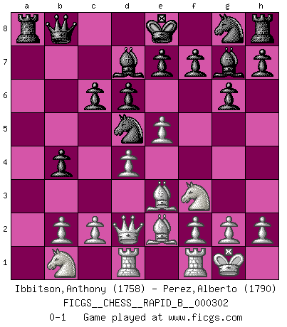 Last move : 0-1 2019 January 7 16:16:57 [Event "FICGS__CHESS__RAPID_B__000302"] [Site "FICGS"] [Date "2018.11.12"] [Round "1"] [White "Ibbitson,Anthony"] [Black "Perez,Alberto"] [Result "0-1"] [WhiteElo "1758"] [BlackElo "1790"] 1.e4 d6 2.d4 g6 3.Nc3 Bg7 4.Be3 c6 5.Qd2 a5 6.Nf3 Na6 7.Be2 b5 8.O-O Nc7 9.a3 Bd7 10.Rad1 b4 11.axb4 axb4 12.Nb1 Qb8 13.e5 Nd5 0-1 This chess game has been lost on time (started : 2018.11.12 21:59:27) King's pawn Opening Kingside Castling by player White (move 8) Player Black won this chess game. Follow this game move after move (download)When I asked Fischer why he had not played a certain move in our game, he replied: 'Well, you laughed when I wrote it down !' (Mikhail Tal) Alles was ich jemals tun will ist Schach spielen. (Robert James Fischer) A través de las casillas del tablero, los Indios explican el movimiento del tiempo y la edad, las influencias mas altas que controlan el mundo y los lazos que vinculan al Ajedrez con el alma humana. (Al-Masudi) La menace est plus forte que l'exécution. (Aaron Nimzovitch) The absolute truth is the thing that makes people laugh. (Carl Reiner)