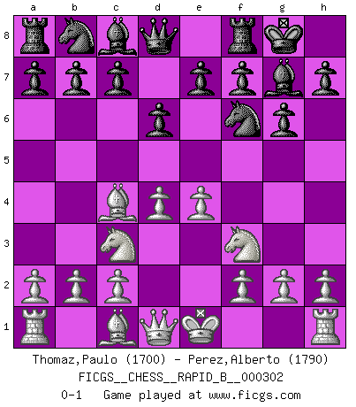 Last move : 0-1 2018 December 29 15:37:57 [Event "FICGS__CHESS__RAPID_B__000302"] [Site "FICGS"] [Date "2018.11.12"] [Round "1"] [White "Thomaz,Paulo"] [Black "Perez,Alberto"] [Result "0-1"] [WhiteElo "1700"] [BlackElo "1790"] 1.e4 d6 2.d4 Nf6 3.Nc3 g6 4.Nf3 Bg7 5.Bc4 O-O 0-1 This chess game has been lost on time (started : 2018.11.12 21:59:27) Pirc : Classical (Two knights) system Kingside Castling by player Black (move 5) Player Black won this chess game. Follow this game move after move (download)We like to think. (Gary Kasparov) Das Schach hält seine Meister in eigenen Banden, Fesseln; auf vielerlei Weise formt es ihren Geist, so dass die innere Freiheit selbst des Stärksten beeinflusst wird. (Albert Einstein) Mi estilo es algo parecido entre un poco de Tal y Petrosian. (Reshevsky) Demandez au pauvre Cg1 ce qu'il en pense. Eduard Gufeld à propos de la variante Saemisch de l'Est-Indienne. At last I discovered the true beauty of chess. So I proposed to her. (Dinesh De Silva)