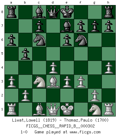 Last move : 1-0 2018 December 23 14:33:50 [Event "FICGS__CHESS__RAPID_B__000302"] [Site "FICGS"] [Date "2018.11.12"] [Round "1"] [White "Liwat,Lowell"] [Black "Thomaz,Paulo"] [Result "1-0"] [WhiteElo "1819"] [BlackElo "1700"] 1.d4 Nf6 2.c4 e6 3.f3 d5 4.a3 dxc4 5.Nc3 Nc6 6.e3 a6 7.Bxc4 b5 8.Bd3 Be7 9.h4 1-0 This chess game has been lost on time (started : 2018.11.12 21:59:27) Queen's pawn game Player White won this chess game. Follow this game move after move (download)The tactician knows what to do when there is something to do; whereas the strategian knows what to do when there is nothing to do. (Gerald Abrahams) Wie gewinnt Tal? Er entwickelt alle seine Figuren in die Brettmitte und opfert sie dann irgendwo. (Robert James Fischer) No es suficiente ser un buen jugador, se debe también de jugar bién. (Siegbert Tarrasch) Ne tendez aucun piège pour le plaisir ! Ne jouez rien dans l'espoir que l'adversaire réagisse de façon stupide ! Prenez toujours pour acquis que l'adversaire va trouver le meilleur coup ! Ne jouez jamais de coup dans l'espoir que l'adversaire ne voie pas la menace ! Chacun de vos coups doit améliorer la position d'une façon ou d'une autre. Whenever people agree with me, I always feel I must be wrong. (Oscar Wilde)