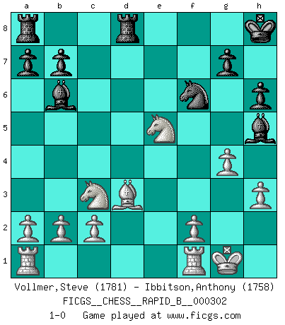 Last move : 1-0 2019 January 1 3:51:34 [Event "FICGS__CHESS__RAPID_B__000302"] [Site "FICGS"] [Date "2018.11.12"] [Round "1"] [White "Vollmer,Steve"] [Black "Ibbitson,Anthony"] [Result "1-0"] [WhiteElo "1781"] [BlackElo "1758"] 1.e4 e6 2.d4 d5 3.Nc3 Nf6 4.e5 Nfd7 5.Nf3 c5 6.Be3 Nc6 7.Be2 cxd4 8.Bxd4 Nxd4 9.Qxd4 Bc5 10.Qg4 O-O 11.O-O f6 12.Qxe6+ Kh8 13.Qxd5 Bb6 14.exf6 Nxf6 15.Qxd8 Rxd8 16.Bd3 Bg4 17.Ne5 Bh5 18.h3 h6 19.g4 1-0 This chess game has been lost on time (started : 2018.11.12 21:59:27) French : Steinitz variation Kingside Castling by player Black (move 10) Kingside Castling by player White (move 11) Player White won this chess game. Follow this game move after move (download)I love all positions. Give me a difficult positional game, I will play it. But totally won positions, I cannot stand them. (Hein Donner) Sehr viele beherrschen heutzutage das große Einmalseins des Schachspiels und kennen sogar dessen Logarithmentafeln auswendig - deshalb sollte man hin und wieder zu beweisen trachten, dass zwei mal zwei auch fünf sein kann. (Mikhail Nekhemyevich Tal) Al jugar al Ajedrez entonces, podemos aprender: Primero: Previsión... Segundo: Prudencia... Tercero: Cautela... Y al final, aprendemos del Ajedrez el hábito de no ser desanimados por apariencias malas presentes en el estado de nuestros asuntos, el hábito de la esperanza por una oportunidad favorable y la perseveración de los secretos de los recursos. (Benjamin Franklin) Le temps de noter son nom sur la feuille de partie, j'étais déjà en zeitnot ! D'un modeste amateur apparié lors de la première ronde d'un open contre le grand-maître Azmaïparashvili. I have opinions of my own - strong opinions - but I don't always agree with them. (George Bush)