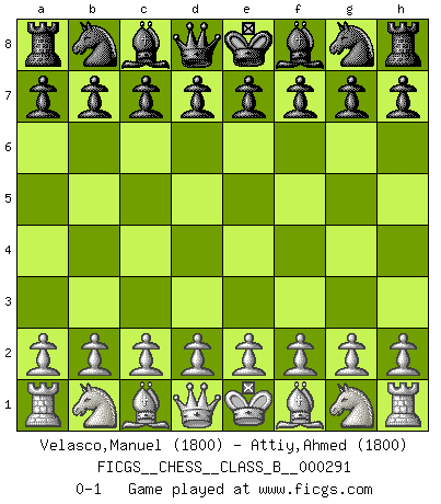 Last move : 0-1 2018 December 23 2:34:6 [Event "FICGS__CHESS__CLASS_B__000291"] [Site "FICGS"] [Date "2018.11.12"] [Round "1"] [White "Velasco,Manuel"] [Black "Attiy,Ahmed"] [Result "0-1"] [WhiteElo "1800"] [BlackElo "1800"] 0-1 This chess game has been lost on time (started : 2018.11.12 22:2:38) Player Black won this chess game. Follow this game move after move (download)Place the contents of the Chess box in a hat, shake them up vigorously, pour them on the board from a height of two feet, and you get the style of Steinitz. (H. E. Bird) Es genügt nicht ein guter Spieler zu sein, man muß auch gut spielen. (Siegbert Tarrasch) El Ajedrez, como cualquier actividad creativa, solo puede existir a través del esfuerzo combinado de aquellos que tienen talento creativo y de aquellos que poseen la habilidad de organizar su trabajo creativo. (Mikhail Botvinnik) On entre au jeu d'Echecs comme on entre en Religion. Pour le joueur d'Echecs, la partie d'Echecs c'est l'office, la messe, le défilé du 1er Mai, le dépôt de gerbe au Monument aux Morts. C'est un drame sacré. (Michel Roos) They say in chess you've got to kill the queen, and then you mate it... Oh I, do you ? (Red Hot Chili Peppers, Fortune faded)