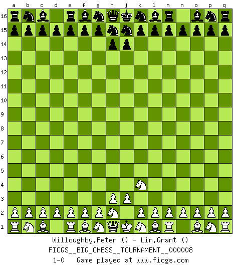 Last move : 1-0 2007 June 24 2:40:25 [Event "FICGS__BIG_CHESS__TOURNAMENT__000008"] [Site "FICGS"] [Date "2007.05.24"] [Round "1"] [White "Willoughby,Peter"] [Black "Lin,Grant"] [Result "1-0"] [WhiteElo ""] [BlackElo ""] 1.j2-k4 1-0 This big chess game has been lost on time (started : 2007.05.24 19:48:21) Follow this game move after move (download)There just isn't enough televised Chess. (David Letterman) Drei Punkte vor allen anderen ist wie einer, der im weißen Anzug posiert, während der Rest in Müllsäcke gekleidet dasteht. (Viktor Kortschnoi) En un gambito tu regalas un Peón por el bién de tomar un juego perdido. (Samuel Standige Boden) Demandez au pauvre Cg1 ce qu'il en pense. Eduard Gufeld à propos de la variante Saemisch de l'Est-Indienne. The smarter you play, the luckier you'll be. (Mark Pilarski)