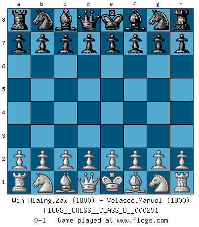 Last move : 0-1 2018 December 23 2:34:6 [Event "FICGS__CHESS__CLASS_B__000291"] [Site "FICGS"] [Date "2018.11.12"] [Round "1"] [White "Win Hlaing,Zaw"] [Black "Velasco,Manuel"] [Result "0-1"] [WhiteElo "1800"] [BlackElo "1800"] 0-1 This chess game has been lost on time (started : 2018.11.12 22:2:38) Player Black won this chess game. Follow this game move after move (download)The Pin is mightier than the sword. (Fred Reinfeld) Schach ist das Spiel, das die Verrückten gesund hält. (Albert Einstein) De eso se trata el Ajedrez. Un día le das una lección a tu oponente y al día siguiente el te da una a tí. (Bobby Fischer) Les échecs sont un jeu par leur forme, un art par leur essence et une science par sa difficulté d'acquisition. Ils peuvent vous procurer autant de plaisir qu'un bon livre ou une belle musique, mais vous n'aurez une réelle joie que si vous arrivez à bien jouer. (Tigran Petrosian) Animated gif is worth one mega-word. (Unknown)