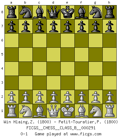 Last move : 0-1 2018 December 23 2:34:6 [Event "FICGS__CHESS__CLASS_B__000291"] [Site "FICGS"] [Date "2018.11.12"] [Round "1"] [White "Win Hlaing,Zaw"] [Black "Petit-Touratier,Philippe"] [Result "0-1"] [WhiteElo "1800"] [BlackElo "1800"] 0-1 This chess game has been lost on time (started : 2018.11.12 22:2:38) Player Black won this chess game. Follow this game move after move (download)Morphy was probably the greatest genius of them all. (Bobby Fischer) Mit sehr nachdenklichem Gesicht schreitet Bobby durch den Turniersaal. Was ist passiert?, fragt Lombardy. Ich stehe schlecht, antwortet Fischer. Lombardy: Dann biete doch einfach Remis an. Fischer: So schlecht stehe ich nun auch wieder nicht! (Robert James Fischer) No es suficiente ser un buen jugador, se debe también de jugar bién. (Siegbert Tarrasch) Avec des compensations pour le matériel en plus... (Anonyme) Ah, beer! The cause of, and the solution to, all of life's problems. (Homer Simpson)