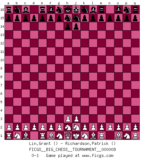 Last move : 0-1 2007 June 23 20:37:11 [Event "FICGS__BIG_CHESS__TOURNAMENT__000008"] [Site "FICGS"] [Date "2007.05.24"] [Round "1"] [White "Lin,Grant"] [Black "Richardson,Patrick"] [Result "0-1"] [WhiteElo ""] [BlackElo ""] 0-1 This big chess game has been lost on time (started : 2007.05.24 19:48:21) Follow this game move after move (download)Some sacrifices are sound; the rest are mine. (Mikhail Tal) Ein unbeabsichtigtes Patt ist der Gipfel der Dummheit. (Anonymous) Un buen jugador siempre tiene buena suerte. (José Raúl Capablanca) Les ravages du H expliquent la différence de niveau entre Tal et Thal [Abergel]. Art is the triumph over chaos. (John Cheever)