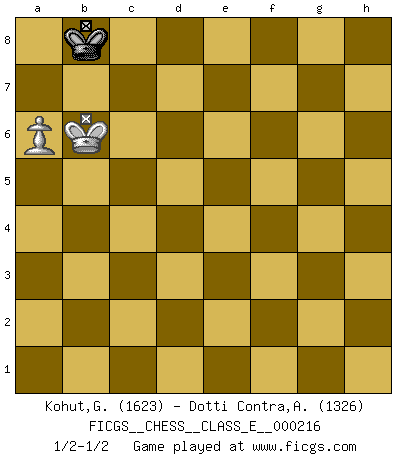 Last move : 1/2-1/2 2019 December 7 17:16:3 [Event "FICGS__CHESS__CLASS_E__000216"] [Site "FICGS"] [Date "2018.11.15"] [Round "1"] [White "Kohut,Gregory"] [Black "Dotti Contra,Alessandro"] [Result "1/2-1/2"] [WhiteElo "1623"] [BlackElo "1326"] 1.e4 e5 2.Nf3 Nc6 3.Bb5 a6 4.Ba4 Nf6 5.O-O Be7 6.Bxc6 dxc6 7.Nc3 Bd6 8.d4 Bg4 9.dxe5 Bxf3 10.Qxf3 Bxe5 11.Bf4 Bxf4 12.Qxf4 O-O 13.Rad1 Qe7 14.Rfe1 Rad8 15.a3 b5 16.g3 h6 17.Kg2 g5 18.Qf5 Rxd1 19.Rxd1 Re8 20.f4 gxf4 21.gxf4 Qe6 22.Qxe6 fxe6 23.Kf3 Kf7 24.Rd2 Rg8 25.Nd1 c5 26.Ne3 Ke7 27.b3 a5 28.c4 b4 29.a4 Rg1 30.Rd1 Rg8 31.e5 Nd7 32.Ng4 Rg6 33.Nf2 Rg8 34.h4 h5 35.Ne4 Rg6 36.Ng3 Rh6 37.Rd2 Ke8 38.Rg2 Nf8 39.Ne4 Ng6 40.Rh2 Ne7 41.Nxc5 Nf5 42.Ke4 Ng3+ 43.Kd3 Nf5 44.Rh3 Rg6 45.Nb7 Rg7 46.Ke4 Rd7 47.Rd3 Rxd3 48.Kxd3 Nxh4 49.Nxa5 Ng2 50.Ke4 h4 51.Kf3 h3 52.f5 Ne3 53.Kg3 Nxf5+ 54.Kxh3 Nd4 55.c5 Nf3 56.Nc6 Ng5+ 57.Kg4 Ne4 58.Nxb4 Nxc5 59.a5 Kd7 60.Kg5 Nxb3 61.a6 Kc8 62.Kf6 c5 63.Kxe6 cxb4 64.Kd5 Nc5 65.Kxc5 b3 66.Kc6 Kb8 67.e6 b2 68.e7 b1Q 69.e8Q+ Ka7 70.Qe7+ Ka8 71.Qf8+ Ka7 72.Qc5+ Kb8 73.Qb6+ Qxb6+ 74.Kxb6 1/2-1/2 Ruy Lopez : Exchange variation doubly deferred (DERLD) Kingside Castling by player White (move 5) Kingside Castling by player Black (move 12) 10 pieces endgame at move 58 : White KNPPPP , Black KNPP WHITE : King + 1 Knight 4 Pawns BLACK : King + 1 Knight 2 Pawns 9 pieces endgame at move 58 : White KNPPP , Black KNPP WHITE : King + 1 Knight 3 Pawns BLACK : King + 1 Knight 2 Pawns 8 pieces endgame at move 60 : White KNPP , Black KNPP WHITE : King + 1 Knight 2 Pawns BLACK : King + 1 Knight 2 Pawns 7 pieces endgame at move 63 : White KNPP , Black KNP WHITE : King + 1 Knight 2 Pawns BLACK : King + 1 Knight 1 Pawn 6 pieces endgame at move 63 : White KPP , Black KNP WHITE : King + 2 Pawns BLACK : King + 1 Knight 1 Pawn 5 pieces endgame at move 65 : White KPP , Black KP WHITE : King + 2 Pawns BLACK : King + 1 Pawn Promotion Queen by player Black (move 68) Promotion Queen by player White (move 69) 4 pieces endgame at move 73 : White KP , Black KQ WHITE : King + 1 Pawn BLACK : King + 1 Queen 3 pieces endgame at move 74 : White KP , Black K WHITE : King + 1 Pawn BLACK : King + This chess game ended in a draw. Follow this game move after move (download)In the perfect Chess combination as in a first-rate short story, the whole plot and counter-plot should lead up to a striking finale, the interest not being allayed until the very last moment. (Yates and Winter) Die FIDE ist dabei in die Hände der russischen Mafia zu fallen. (Larry Evans) No es tiempo de jugar al Ajedrez cuando la casa esta en llamas. (Proverbio Italiano) RxDa4 pat (...) A woman without a man is like a fish without a bicycle. (Gloria Steinem)