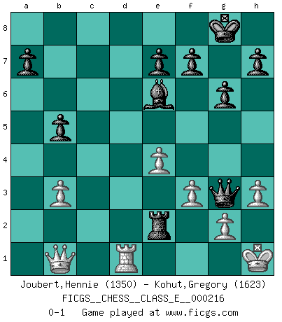 Last move : 0-1 2019 February 27 21:14:20 [Event "FICGS__CHESS__CLASS_E__000216"] [Site "FICGS"] [Date "2018.11.15"] [Round "1"] [White "Joubert,Hennie"] [Black "Kohut,Gregory"] [Result "0-1"] [WhiteElo "1350"] [BlackElo "1623"] 1.e4 c5 2.Nf3 Nc6 3.d4 cxd4 4.Nxd4 g6 5.c4 Nf6 6.Nc3 d6 7.Be2 Nxd4 8.Qxd4 Bg7 9.O-O O-O 10.Qd1 Be6 11.Bg5 Rc8 12.b3 Qa5 13.Bd2 Rfe8 14.Nd5 Qa6 15.c5 Qc6 16.Nxf6+ Bxf6 17.Rc1 dxc5 18.f3 Red8 19.Qc2 Bd4+ 20.Kh1 b5 21.Bc3 c4 22.Bxd4 Rxd4 23.h3 Qd6 24.Rcd1 cxb3 25.Qb2 Rxd1 26.Rxd1 Rc2 27.Qb1 Qg3 28.axb3 Rxe2 0-1 Sicilian : Accelerated Fianchetto, Maroczy bind Kingside Castling by player White (move 9) Kingside Castling by player Black (move 9) Player Black won this chess game. Follow this game move after move (download)Fischer wanted to give the Russians a taste of their own medicine. (Larry Evans) Offener Brief an US-Präsident Bush anlässlich der Verhaftung Bobby Fishers: Verhaften Sie mich. Stecken Sie mich in dieselbe Zelle wie Bobby Fisher und geben Sie uns ein Schachspiel mit. (Boris Vassilievich Spassky) Morphy probablemente fue el genio más grande de todos. (Bobby Fischer) La guerre est enfant de la passion, la passion est enfant du narcissisme et le narcissisme est l'enfant. (...) Une autre partie ? (Thibault de Vassal) The next best thing to gambling and winning is gambling and loosing. (Nick Dandalos)