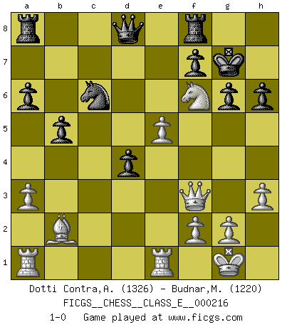 Last move : 1-0 2019 February 20 7:9:9 [Event "FICGS__CHESS__CLASS_E__000216"] [Site "FICGS"] [Date "2018.11.15"] [Round "1"] [White "Dotti Contra,Alessandro"] [Black "Budnar,Milos"] [Result "1-0"] [WhiteElo "1326"] [BlackElo "1220"] 1.e4 e5 2.Nf3 Nc6 3.Bc4 Bc5 4.O-O h6 5.Nc3 Nf6 6.d3 O-O 7.Nd5 d6 8.h3 Be6 9.a3 a6 10.b4 Bd4 11.Nxd4 Nxd4 12.c3 Nb5 13.Bb2 Na7 14.Re1 c6 15.Ne3 Bxc4 16.Nxc4 b5 17.Ne3 g6 18.Qf3 c5 19.bxc5 dxc5 20.d4 cxd4 21.cxd4 exd4 22.Nd5 Nc6 23.Nxf6+ Kg7 24.e5 1-0 Giuoco Piano Kingside Castling by player White (move 4) Kingside Castling by player Black (move 6) Player White won this chess game. Follow this game move after move (download)Checkers is for tramps. (Paul Morphy) Ohne ihre Erfolge schmälern zu wollen würde ich sagen Petrosian, Spassky und Karpov verdanken ihre Siege ihren Trainern - Boleslavsky, Bondarevsky und Furman. (Mikhail Moiseyevich Botvinik) ¿Cual es el objetivo de jugar una apertura de gambito?... Para adquirir una reputación de ser un jugador apuesto a costo de perder el juego. (Siegbert Tarrasch) L'ordinateur a tué l'originalité. Il n'y a plus guère d'aventures sur l'échiquier. (Jacob Murray) Life is the sum of all your choices. (Albert Camus)