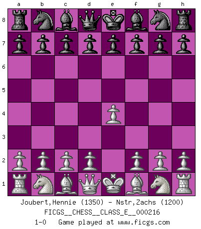 Last move : 1-0 2018 December 25 14:55:20 [Event "FICGS__CHESS__CLASS_E__000216"] [Site "FICGS"] [Date "2018.11.15"] [Round "1"] [White "Joubert,Hennie"] [Black "Nstr,Zachs"] [Result "1-0"] [WhiteElo "1350"] [BlackElo "1200"] 1.e4 1-0 This chess game has been lost on time (started : 2018.11.15 2:20:15) King's pawn Opening Player White won this chess game. Follow this game move after move (download)Even the laziest King flees wildly in the face of a double check ! (Aaron Nimzowitsch) Was ist der Unterschied zwischen einem Strassenarbeiter und einem Schachspieler? --Der Schachspieler bewegt sich ab und zu. (Anonymous) Todos los Maestros de Ajedrez fueron un día unos principiantes. (Chernev) Les Echecs ne sont pas pour les âmes timides. Ils requièrent un homme entier, qui ne s'arrête pas aveuglément à ce qui a été déjà établi, mais qui tente individuellement de sonder les profondeurs du jeu. (W. Steinitz) If you are good, you will be assigned all the work. If you are really good, you will get out of it. (Dan Rotaru)