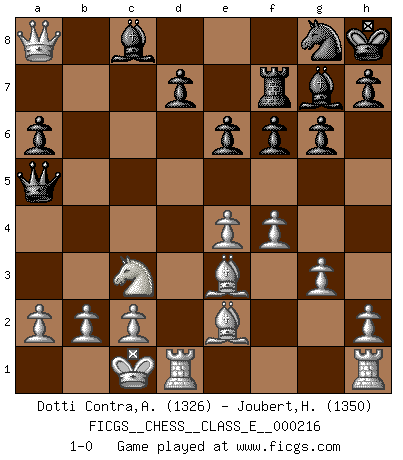 Last move : 1-0 2018 December 14 7:36:33 [Event "FICGS__CHESS__CLASS_E__000216"] [Site "FICGS"] [Date "2018.11.15"] [Round "1"] [White "Dotti Contra,Alessandro"] [Black "Joubert,Hennie"] [Result "1-0"] [WhiteElo "1326"] [BlackElo "1350"] 1.e4 c5 2.Nf3 e6 3.Nc3 Nc6 4.Bb5 Nge7 5.d4 cxd4 6.Nxd4 a6 7.Be2 g6 8.Bg5 Bg7 9.Nxc6 bxc6 10.Qd6 f6 11.Be3 O-O 12.O-O-O Kh8 13.f4 Rf7 14.g3 Ng8 15.Qxc6 Qa5 16.Qxa8 1-0 Sicilian defense Kingside Castling by player Black (move 11) Queenside Castling by player White (move 12) Player White won this chess game. Follow this game move after move (download)Could we look into the head of a Chess player, we should see there a whole world of feelings, images, ideas, emotion and passion. (Alfred Binet) Der Knackpunkt bei der Konzentration ist, daß wir nur durch sie etwas Neues und Ungewöhnliches am Schachbrett finden können. Sie ist der einzige Weg durch neue neue Ideen eine Überraschung zu bereiten. (Garry Kasparov) El Ajedrez moderno está demasiado preocupado con cosas como la estructura de Peones. Olvidenlo, el Jaque Mate termina la partida. (Nigel Short) Karpov est une pièce de musée. (Garry Kasparov) No, no, you're not thinking; you're just being logical. (Niels Bohr)