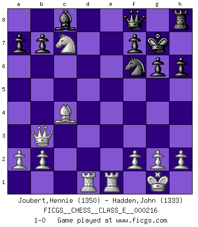 Last move : 1-0 2018 December 3 14:56:8 [Event "FICGS__CHESS__CLASS_E__000216"] [Site "FICGS"] [Date "2018.11.15"] [Round "1"] [White "Joubert,Hennie"] [Black "Hadden,John"] [Result "1-0"] [WhiteElo "1350"] [BlackElo "1333"] 1.e4 e5 2.Nf3 Nc6 3.Bc4 h6 4.d4 exd4 5.c3 dxc3 6.Qb3 Qe7 7.O-O d6 8.Nxc3 g6 9.Nd5 Qd7 10.Bf4 Be7 11.e5 Nxe5 12.Nxe5 dxe5 13.Bxe5 Kf8 14.Nxc7 Bf6 15.Bxf6 Nxf6 16.Nxa8 Kg7 17.Rad1 Qe7 18.Rfe1 Qf8 19.Nc7 1-0 King's pawn game Kingside Castling by player White (move 7) Player White won this chess game. Follow this game move after move (download)Live, lose, and learn, by observing your opponent how to win. (Amber Steenbock) Ich brauche nur einen Blick auf das Schachbrett zu werfen, und weiß schon, was in der Stellung steckt, was geschehen kann und was geschehen wird. Alle übrigen suchen und prüfen, ich aber weiß es! (José Raúl Capablanca) Aún deseo matar a Fischer. (Boris Spassky) Le joueur d'Echecs qui veut atteindre le top est obligé de développer son propre credo créatif. Alexeï Stepanovicth Souétine. Il est facile d'écrire des livres ! Ce qui est difficile, c'est de jouer ! (Alexeï Stepanovicth Souétine) When you've done things right people won't know you've done anything at all. (Futurama)