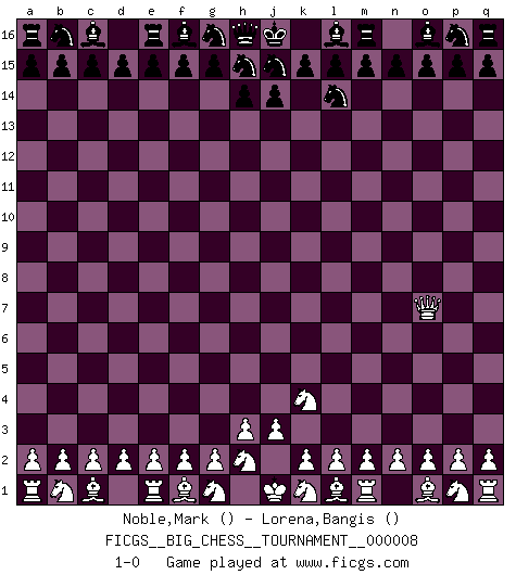 Last move : 1-0 2007 June 25 2:49:15 [Event "FICGS__BIG_CHESS__TOURNAMENT__000008"] [Site "FICGS"] [Date "2007.05.24"] [Round "1"] [White "Noble,Mark"] [Black "Lorena,Bangis"] [Result "1-0"] [WhiteElo ""] [BlackElo ""] 1.j2-k4 k16-l14 2.h1-o7 1-0 This big chess game has been lost on time (started : 2007.05.24 19:48:21) Follow this game move after move (download)Nothing excites jaded Grandmasters more than a theoretical novelty. (Dominic Lawson) Es gibt zwei Arten von Opfern: Korrekte und meine. (Mikhail Nekhemyevich Tal) Yo jugué Ajedrez con el y a veces le pude haber ganado solo que siempre devuelve su última jugada y juega la partida de manera diferente. (Mark Twain) Les réformistes prétendent que les progrès de la théorie conduiront à la disparition des échecs, et qu'il faut, pour leur rendre vie, en remanier les règles. En réalité, qu'exprime cette affirmation? Le mépris de l'intuition, de l'imagination et de tous les autres éléments qui font des échecs un art. (Alexander Alekhine) Heh, heh, heh. Time to abandon ship. (General Grievous in Star Wars ep.3)