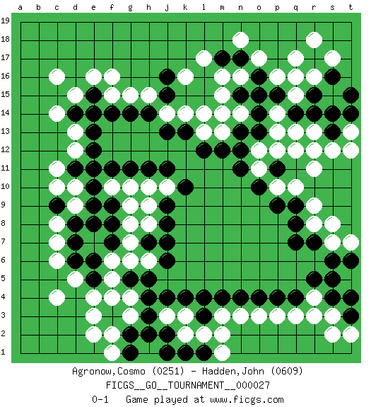 Last move : 0-1 2019 February 10 18:20:24 [Event "FICGS__GO__TOURNAMENT__000027"] [Site "FICGS"] [Date "2018.11.16"] [Round "1"] [Black "Agronow,Cosmo"] [White "Hadden,John"] [Result "0-1"] [Rating 1 "0251"] [Rating 2 "0609"] 1.q16 c4 2.q4 c16 3.f3 e3 4.e5 d9 5.f9 k16 6.m14 o17 7.o15 m16 8.h14 g15 9.e13 d13 10.e12 d12 11.d7 c7 12.d8 c8 13.e9 q17 14.r17 p16 15.p15 q10 16.o10 q13 17.o13 q15 18.q14 r16 19.q8 r8 20.q7 q3 21.k4 m3 22.m4 k3 23.h3 j3 24.j4 d5 25.s6 r9 26.r15 q16 27.r14 s15 28.s14 s17 29.l3 l2 30.l4 n3 31.n4 r3 32.e15 e16 33.c9 d10 34.d11 c10 35.e10 c11 36.e11 d15 37.d14 c14 38.e14 f15 39.g14 k14 40.k13 h15 41.j15 j14 42.j13 l14 43.k10 l13 44.l12 m13 45.m12 n14 46.n13 m15 47.o14 p13 48.r12 r13 49.s13 q12 50.q11 r11 51.p11 s12 52.t15 p14 53.p12 r12 54.s16 r18 55.n15 m14 56.j16 t13 57.n17 n16 58.o16 n18 59.m17 l17 60.r7 p10 61.p9 o11 62.n12 o12 63.n11 r4 64.p4 p3 65.o4 o3 66.f14 f16 67.t14 t12 68.q9 s8 69.p11 p12 70.r5 s7 71.t6 t7 72.s5 e4 73.f4 f2 74.g2 e2 75.g1 f1 76.d6 c6 77.j2 k2 78.k1 m2 79.s4 s3 80.t3 t2 81.t4 s2 82.l1 m1 83.j1 h1 84.h2 f5 85.e6 g4 86.h4 g3 87.g5 f6 88.e8 g6 89.h5 h6 90.j6 h8 91.h7 g7 92.j7 g9 93.j8 h9 94.j9 h10 95.h11 g10 96.g11 j10 97.j11 f10 98.f11 g8 99.f7 f4 100.f8 pass 0-1 Here are the names of the openings (joseki) played in the four corners : Corner d4 : c4 f3 Komoku (Somok, Xiao~mu`) 3-4 Point. The komoku (3-4) point is the traditional corner enclosure move.. Niken Kakari (Dukan Keolch'im, E`r Gua`jiao~, 2-Space Low Approach). Black 2 is used with friendly forces backing it up. Its purpose is to prevent a pincer. Locally it results in a loss, but may be appropriate fuseki strategy. It was popular in the late 1950s and early 1960s, but is not seen often nowadays, having been replaced by the one-space high approach, with which it has points in common. Corner d16 : c16 h14 Komoku (Somok, Xiao~mu`) 3-4 Point. The komoku (3-4) point is the traditional corner enclosure move.. Player White won this Go (weiqi, baduk) game. Follow this game move after move (download)You have to like to win, and to learn to recognize the errors that gave you the victory. (Pierre Audouard) The man who strikes first admits that his ideas have given out. (Chinese proverb)