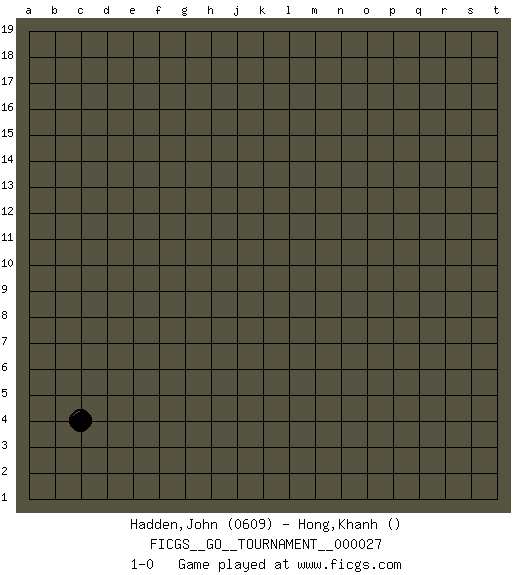Last move : 1-0 2018 December 16 2:3:45 [Event "FICGS__GO__TOURNAMENT__000027"] [Site "FICGS"] [Date "2018.11.16"] [Round "1"] [Black "Hadden,John"] [White "Hong,Khanh"] [Result "1-0"] [Rating 1 "0609"] 1.c4 1-0 This go game has been lost on time (started : 2018.11.16 0:30:23) Here are the names of the openings (joseki) played in the four corners : Corner d4 : c4 1-0 Komoku (Somok, Xiao~mu`) 3-4 Point. The komoku (3-4) point is the traditional corner enclosure move.. Player Black won this Go (weiqi, baduk) game. Follow this game move after move (download)If there is no stone on the handicap point, the carpenter's square is dead. (Anonymous) War is the child of passion, passion is the child of narcissism and narcissism is the child. (...) Another game ? (Thibault de Vassal)