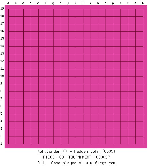 Last move : 0-1 2018 December 16 2:3:45 [Event "FICGS__GO__TOURNAMENT__000027"] [Site "FICGS"] [Date "2018.11.16"] [Round "1"] [Black "Koh,Jordan"] [White "Hadden,John"] [Result "0-1"] [Rating 2 "0609"] 0-1 This go game has been lost on time (started : 2018.11.16 0:30:23) Here are the names of the openings (joseki) played in the four corners : Player White won this Go (weiqi, baduk) game. Follow this game move after move (download)Don't make a play adjacent to a cutting-point. (Anonymous) If you work for a living, why do you kill yourself working ? (Tuco to a chicken in The Good, The Bad and The Ugly)
