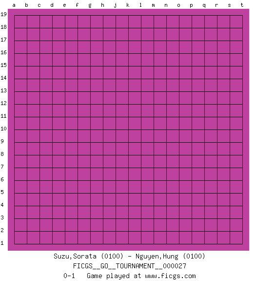 Last move : 0-1 2018 December 16 2:3:45 [Event "FICGS__GO__TOURNAMENT__000027"] [Site "FICGS"] [Date "2018.11.16"] [Round "1"] [Black "Suzu,Sorata"] [White "Nguyen,Hung"] [Result "0-1"] [Rating 1 "0100"] [Rating 2 "0100"] 0-1 This go game has been lost on time (started : 2018.11.16 0:30:23) Here are the names of the openings (joseki) played in the four corners : Player White won this Go (weiqi, baduk) game. Follow this game move after move (download)Go uses the most elemental materials and concepts - line and circle, wood and stone, black and white - combining them with simple rules to generate subtle strategies and complex tactics that stagger the imagination. (Iwamoto Kaoru, 9 dan professional Go player and former Honinbo title holder) To err is human, to shift the blame on someone else is tactical. (Mladen Jankovic)