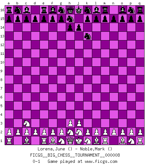 Last move : 0-1 2007 June 24 20:47:48 [Event "FICGS__BIG_CHESS__TOURNAMENT__000008"] [Site "FICGS"] [Date "2007.05.24"] [Round "1"] [White "Lorena,June"] [Black "Noble,Mark"] [Result "0-1"] [WhiteElo ""] [BlackElo ""] 1.b1-c3 j15-k13 0-1 This big chess game has been lost on time (started : 2007.05.24 19:48:21) Follow this game move after move (download)The blunders are all there on the board, waiting to be made. (Savielly Tartakover) Es hat in meinem Leben Zeiten gegeben, in denen das Schachspiel, wenn nicht zum Lebenszweck, so doch zu einem regelrechten Lebensersatz geworden ist. Man fühlt sich in solchen Zeiten nicht so, als besäße man eine göttliche Gabe, sondern eher so, als sei man von ihr besessen. (Garry Kasparov) ¡Examina movidas que hagan daño! Un buen ojo for movidas desvastantes es mucho mas importante que el conocimiento de principios estratégicos. (Purdy) Dieu déplace le joueur, et celui-ci la pièce. Quel Dieu derrière Dieu commence donc la trame ? Arturo Perez-Reverte (prix de littérature policière 1993). Players are not good because they find tactics, it is about the way to find the positions in which those tactics are hidden. (Luc-Olivier Leclerc)