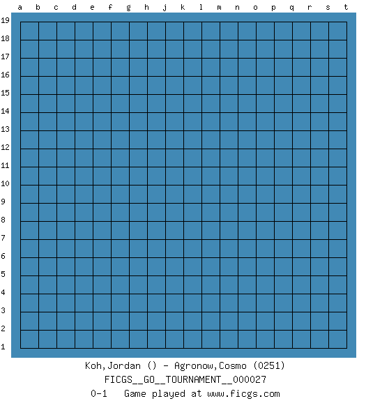 Last move : 0-1 2018 December 16 2:3:45 [Event "FICGS__GO__TOURNAMENT__000027"] [Site "FICGS"] [Date "2018.11.16"] [Round "1"] [Black "Koh,Jordan"] [White "Agronow,Cosmo"] [Result "0-1"] [Rating 2 "0251"] 0-1 This go game has been lost on time (started : 2018.11.16 0:30:23) Here are the names of the openings (joseki) played in the four corners : Player White won this Go (weiqi, baduk) game. Follow this game move after move (download)Always remember, keep the balance. [between territory and influence] (Figaro) I find television to be very educating. Every time somebody turns on the set, I go in the other room and read a book. (Groucho Marx)