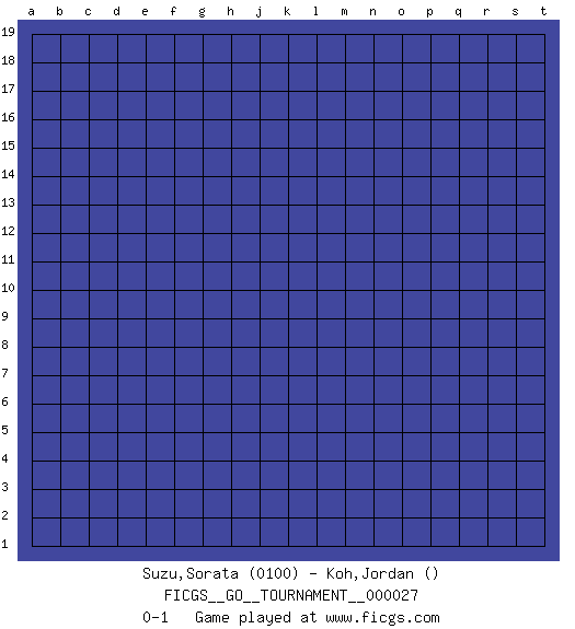 Last move : 0-1 2018 December 16 2:3:45 [Event "FICGS__GO__TOURNAMENT__000027"] [Site "FICGS"] [Date "2018.11.16"] [Round "1"] [Black "Suzu,Sorata"] [White "Koh,Jordan"] [Result "0-1"] [Rating 1 "0100"] 0-1 This go game has been lost on time (started : 2018.11.16 0:30:23) Here are the names of the openings (joseki) played in the four corners : Player White won this Go (weiqi, baduk) game. Follow this game move after move (download)On the third line, four die, six live. (Anonymous) Memory is a way of holding onto the things you love, the things you are, the things you never want to lose. (from the television show: The Wonder Years)