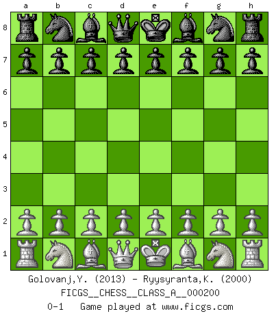 Last move : 0-1 2018 December 28 3:38:36 [Event "FICGS__CHESS__CLASS_A__000200"] [Site "FICGS"] [Date "2018.11.17"] [Round "1"] [White "Golovanj,Yaroslav"] [Black "Ryysyranta,Kaaleppi"] [Result "0-1"] [WhiteElo "2013"] [BlackElo "2000"] 0-1 This chess game has been lost on time (started : 2018.11.17 15:39:48) Player Black won this chess game. Follow this game move after move (download)Discovered check is the dive bomber of the Chessboard. (Reuben Fine) Ich erzeugte keinen Neid, da mich die Schachspieler als Musiker und die Musiker als Schachspieler betrachteten. (Mark Taimanov) La batalla por la última verdad nunca sera ganada. Y es por eso que el Ajedrez es tan fascinante. (Hans Kmoch) Les Cavaliers se révèlent fort utiles dans les positions fermées. D'habitude, les Fous sont un peu plus forts que les Cavaliers dans les positions ouvertes. Qu'on le veuille ou non, il restera toujours des exceptions ! Luck is when opportunity knocks and you answer. (Anonymous)