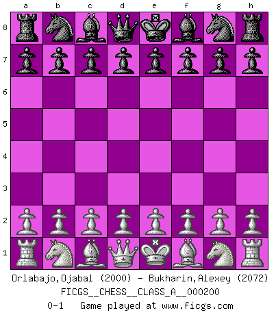 Last move : 0-1 2018 December 28 3:38:36 [Event "FICGS__CHESS__CLASS_A__000200"] [Site "FICGS"] [Date "2018.11.17"] [Round "1"] [White "Orlabajo,Ojabal"] [Black "Bukharin,Alexey"] [Result "0-1"] [WhiteElo "2000"] [BlackElo "2072"] 0-1 This chess game has been lost on time (started : 2018.11.17 15:39:48) Player Black won this chess game. Follow this game move after move (download)I know people who have all the will in the world, but still can't play good Chess. (Bobby Fischer) Er war ein guter Schachspieler, aber ich kann Leute nicht ausstehen, die 'Heil Hitler' rufen (Über Alexander Aljechin). (Miguel Najdorf) Una clavada es mas poderosa que una espada. (Fred Reinfeld) Comme les marins qui ont mille raisons différentes d'aller en mer, les joueurs d'échecs en ont tout autant avant de s'installer devant une table et jouer... (Vincent Bertignac, philosophe) The difference between perseverance and obstinacy is that one comes from a strong will, and the other from a strong won't. (Henry Ward Beecher)