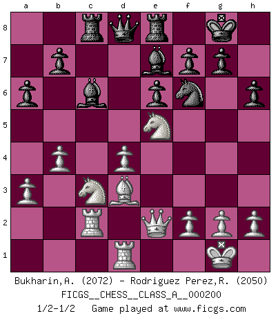 Last move : 1/2-1/2 2019 March 20 20:37:22 [Event "FICGS__CHESS__CLASS_A__000200"] [Site "FICGS"] [Date "2018.11.17"] [Round "1"] [White "Bukharin,Alexey"] [Black "Rodriguez Perez,Rene"] [Result "1/2-1/2"] [WhiteElo "2072"] [BlackElo "2050"] 1.e4 e6 2.d4 d5 3.Nd2 c5 4.c3 cxd4 5.cxd4 dxe4 6.Nxe4 Nf6 7.Bd3 Bd7 8.Nc3 Bc6 9.Nf3 Nbd7 10.O-O Be7 11.Qe2 O-O 12.Rd1 Nd5 13.a3 Rc8 14.Be3 Nxe3 15.Qxe3 Qb6 16.Nd2 Qd8 17.Nf3 Qb6 18.Nd2 h6 19.Nc4 Qd8 20.Rac1 Qc7 21.Qe2 Rfe8 22.Rc2 a6 23.b4 Nf6 24.Ne5 Qb6 25.Nc4 Qd8 26.Ne5 Qb6 27.Nc4 Qd8 28.Ne5 1/2-1/2 French : Tarrasch, Open variation Kingside Castling by player White (move 10) Kingside Castling by player Black (move 11) This chess game ended in a draw. Follow this game move after move (download)Those who say they understand Chess, understand nothing. (Robert Hubner) Obendrein hat der FIDE-Präsident den Revolutionsführer Gaddafi zum »Großmeister« ernannt, am Ende der WM. Das ist lächerlich! (Joel Lautier) Todo se encuentra en un estado de flujo y esto incluye al mundo del Ajedrez. (Mikhail Botvinnik) Aidez vos pièces, elles vous aideront. (Paul Morphy) There are two kinds of tragedy in this world, one is not getting what you want and the other is getting. (Lord of war)