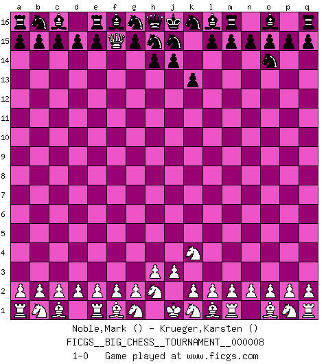 Last move : 1-0 2007 June 26 2:54:14 [Event "FICGS__BIG_CHESS__TOURNAMENT__000008"] [Site "FICGS"] [Date "2007.05.24"] [Round "1"] [White "Noble,Mark"] [Black "Krueger,Karsten"] [Result "1-0"] [WhiteElo ""] [BlackElo ""] 1.j2-k4 k15-k13 2.h1-o7 p16-o14 3.o7-f15 1-0 This big chess game has been lost on time (started : 2007.05.24 19:48:21) Follow this game move after move (download)The older I grow, the more I value pawns. (Paul Keres) Ich brauche nur einen Blick auf das Schachbrett zu werfen, und weiß schon, was in der Stellung steckt, was geschehen kann und was geschehen wird. Alle übrigen suchen und prüfen, ich aber weiß es! (José Raúl Capablanca) Estaba muy claro de que el punto vulnerable del Gran Maestro Americano (Bobby Fischer) radicaba en las posiciones de doble filo, colgantes, irracionales, donde el siempre falló en encontrar un triunfo aún en una posición de clara victoria. (Efim Geller) Le temps de noter son nom sur la feuille de partie, j'étais déjà en zeitnot ! D'un modeste amateur apparié lors de la première ronde d'un open contre le grand-maître Azmaïparashvili. Computers make it easier to do a lot of things, but most of the things they make it easier to do don't need to be done. (Andy Rooney)