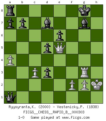 Last move : 1-0 2018 December 10 17:53:58 [Event "FICGS__CHESS__RAPID_B__000303"] [Site "FICGS"] [Date "2018.11.17"] [Round "1"] [White "Ryysyranta,Kaaleppi"] [Black "Vestenicky,Patrik"] [Result "1-0"] [WhiteElo "2000"] [BlackElo "1838"] 1.e4 c5 2.Nf3 e6 3.c3 Nc6 4.d4 d5 5.e5 Qb6 6.a3 f6 7.Bd3 fxe5 8.dxe5 c4 9.Bc2 Nge7 10.Qe2 Qc7 11.O-O g6 12.Re1 Bg7 13.a4 Bd7 14.Nbd2 O-O 15.h4 Rf7 16.Ng5 R7f8 17.Ndf3 Nf5 18.h5 h6 19.hxg6 hxg5 20.Nxg5 Nxe5 21.Bf4 Nh6 22.Nf7 Rxf7 23.gxf7+ Nhxf7 24.Qh5 Qb6 25.Re3 Nd3 26.Bxd3 cxd3 27.Rg3 Qxb2 28.Be5 Nxe5 29.Qxe5 Qxa1+ 30.Kh2 1-0 Sicilian defense Kingside Castling by player White (move 11) Kingside Castling by player Black (move 14) Player White won this chess game. Follow this game move after move (download)Fischer wanted to give the Russians a taste of their own medicine. (Larry Evans) Schach ist eine Sache der genauen Beurteilung, wann man zuschlagen und wann man sich ducken muss. (Robert James Fischer) ¿Esta Bobby Fischer algo cuerdo?. (Salo Flohr) La tactique, c'est ce que vous faites quand il y a quelque chose à faire; la stratégie, c'est ce que vous faites quand il n'y a rien à faire. (Savielli Tartacower) The Movers & Shakers of this world are those who play chess in the mornings and go to the disco in the evenings. (Dinesh De Silva)