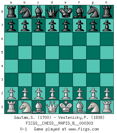 Last move : 0-1 2018 December 18 2:6:30 [Event "FICGS__CHESS__RAPID_B__000303"] [Site "FICGS"] [Date "2018.11.17"] [Round "1"] [White "Gautam,Surya Prakash"] [Black "Vestenicky,Patrik"] [Result "0-1"] [WhiteElo "1700"] [BlackElo "1838"] 0-1 This chess game has been lost on time (started : 2018.11.17 19:18:39) Player Black won this chess game. Follow this game move after move (download)Fischer, who may or may not be mad as a hatter, has every right to be horrified. (Jeremy Silman) Darum geht es im Schach. Einen Tag gibst du deinem Gegner eine Lektion, am nächsten Tag gibt er dir eine. (Robert James Fischer) Con o sin el título, Bobby Fischer fue sin lugar a dudas el mas grande jugador de su época. (Burt Hochberg) A chaque perte on perd un peu de soi. (Joël Lautier) But they are useless. They can only give you answers. (Pablo Picasso, about computers)