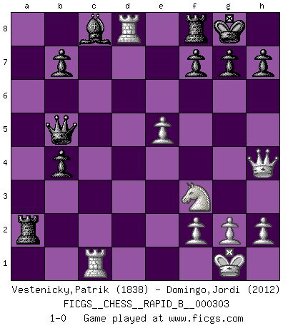 Last move : 1-0 2019 January 8 18:2:57 [Event "FICGS__CHESS__RAPID_B__000303"] [Site "FICGS"] [Date "2018.11.17"] [Round "1"] [White "Vestenicky,Patrik"] [Black "Domingo,Jordi"] [Result "1-0"] [WhiteElo "1838"] [BlackElo "2012"] 1.d4 d5 2.c4 dxc4 3.e4 e5 4.Nf3 exd4 5.Bxc4 Bb4+ 6.Nbd2 Nc6 7.O-O Nf6 8.e5 Nd5 9.Nb3 Nb6 10.Bb5 Qd5 11.Bxc6+ Qxc6 12.Nbxd4 Qd5 13.Qc2 Qc4 14.Qe4 Qd5 15.Qh4 O-O 16.Nc2 a5 17.Nxb4 axb4 18.Be3 Nc4 19.Rfd1 Qb5 20.Bd4 c5 21.b3 cxd4 22.bxc4 Qxc4 23.Rac1 Qb5 24.Rxd4 Rxa2 25.Rd8 1-0 QGA : 3.e4 Kingside Castling by player White (move 7) Kingside Castling by player Black (move 15) Player White won this chess game. Follow this game move after move (download)Good positions don't win games, good moves do. (Gerald Abrahams) Schach ist mein Leben, meine Leidenschaft, was ich gelernt habe und seit meinem 14. Lebensjahr profimässig praktiziere. Darauf zu verzichten, würde mir sehr schwer fallen. (Viktor Kortschnoi) El Ajedrez es una hermosa aventura. (Bent Larsen) Je crois qu'il existe des manières très spécifiques de jouer efficacement contre une machine. Evidemment, nous n'avons aucune chance en technique pure, parce que l'ordinateur calcule de manière parfaite. Mais lorsque nous faisons appel à notre cerveau, en utilisant l'intuition et la compréhension, alors nous restons beaucoup plus forts. (Anatoli Karpov) To steal ideas from one person is plagiarism. To steal from many is research. (Unknown)