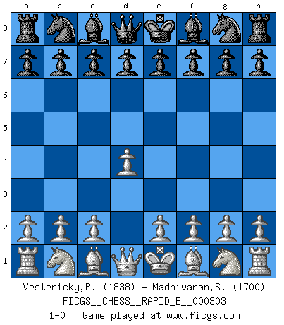 Last move : 1-0 2018 December 18 2:6:30 [Event "FICGS__CHESS__RAPID_B__000303"] [Site "FICGS"] [Date "2018.11.17"] [Round "1"] [White "Vestenicky,Patrik"] [Black "Madhivanan,Sanjaykumar"] [Result "1-0"] [WhiteElo "1838"] [BlackElo "1700"] 1.d4 1-0 This chess game has been lost on time (started : 2018.11.17 19:18:39) Queen's pawn Player White won this chess game. Follow this game move after move (download)As one by one I mowed them down, my superiority soon became apparent. (Jose Capablanca) Kein Schachspieler kann gut schlafen. (H. G. Wells) Un Peón pasado aumenta su poder a medida de que el número de piezas en el tablero disminuye. (Capablanca) Les échecs sont un jeu terrible. Si vous n'avez pas le centre, votre adversaire a une position plus libre. Par contre, si vous avez le centre, alors vous avez vraiment quelque chose pour laquelle vous inquiéter ! (Siegbert Tarrasch) The man who strikes first admits that his ideas have given out. (Chinese proverb)