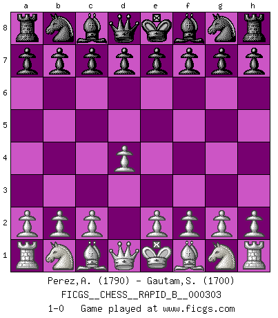 Last move : 1-0 2018 December 18 2:6:30 [Event "FICGS__CHESS__RAPID_B__000303"] [Site "FICGS"] [Date "2018.11.17"] [Round "1"] [White "Perez,Alberto"] [Black "Gautam,Surya Prakash"] [Result "1-0"] [WhiteElo "1790"] [BlackElo "1700"] 1.d4 1-0 This chess game has been lost on time (started : 2018.11.17 19:18:39) Queen's pawn Player White won this chess game. Follow this game move after move (download)We like to think. (Gary Kasparov) Ich tröste mich mit dem Vergnügen, daß Schachfans, Zuschauer und Leser glücklich sind, wenn ein Großmeister etwas riskiert, statt nur Klötzchen zu schieben. (Mikhail Nekhemyevich Tal) La caracteristica mas importante en la posición del Ajedrez es la actividad de las piezas. Esto es absolutamente fundamental en todas las fases del juego: Apertura, Juego Medio y especialmente Finales. La limitación primordial en la actividad de una pieza, es la estructuración de los Peones. (Michael Stean) Horreur, mais aussi harmonie suprême : qu'y avait-il en effet au monde en dehors des échecs ? Le brouillard, l'inconnu, le non-être... (Vladimir Nabokov) Lamb in skin of tiger, still fears the wolf. (Chinese proverb)