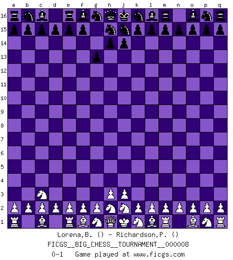 Last move : 0-1 2007 June 25 2:49:15 [Event "FICGS__BIG_CHESS__TOURNAMENT__000008"] [Site "FICGS"] [Date "2007.05.24"] [Round "1"] [White "Lorena,Bangis"] [Black "Richardson,Patrick"] [Result "0-1"] [WhiteElo ""] [BlackElo ""] 1.b1-c3 g15-g13 0-1 This big chess game has been lost on time (started : 2007.05.24 19:48:21) Follow this game move after move (download)All I want to do, ever, is just play Chess. (Bobby Fischer) Schach ist das Spiel, das die Verrückten gesund hält. (Albert Einstein) Mi estilo es algo parecido entre un poco de Tal y Petrosian. (Reshevsky) À la honte des hommes, on sait que les lois du jeu sont les seules qui soient partout justes, claires, inviolables et exécutées. Pourquoi l'Indien qui a donné les règles du jeu d'échecs est-il obéi de bon gré dans toute la terre, et que les décrétales des papes, par exemple, sont aujourd'hui un objet d'horreur et de mépris ? C'est que l'inventeur des échecs combina tout avec justesse pour la satisfaction des joueurs, et que les papes, dans leurs décrétales, n'eurent en vue que leur seul avantage. L'Indien voulut exercer également l'esprit des hommes et leur donner du plaisir; les papes ont voulu abrutir l'esprit des hommes. Voltaire (Dictionnaire philosophique / Garnier 1967) Every vice is only an exaggeration of a necessary and virtuous function. (Ralph Waldo Emerson, Journals 1936)