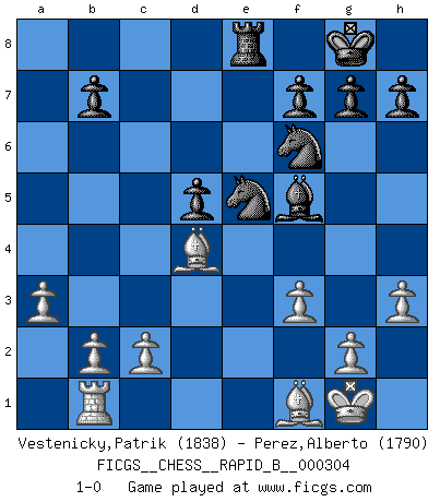 Last move : 1-0 2019 February 5 7:28:19 [Event "FICGS__CHESS__RAPID_B__000304"] [Site "FICGS"] [Date "2018.11.21"] [Round "1"] [White "Vestenicky,Patrik"] [Black "Perez,Alberto"] [Result "1-0"] [WhiteElo "1838"] [BlackElo "1790"] 1.e4 e6 2.Nf3 c5 3.Nc3 Nc6 4.d4 cxd4 5.Nxd4 a6 6.Ndb5 axb5 7.Nxb5 Qa5 8.Nc3 Nf6 9.Bd3 Bc5 10.O-O O-O 11.a3 Qb6 12.Rb1 Bd4 13.Nb5 d5 14.exd5 exd5 15.Nxd4 Qxd4 16.Be3 Qg4 17.Re1 Bf5 18.Bc5 Rfe8 19.Qxg4 Bxg4 20.h3 Bd7 21.Rxe8+ Rxe8 22.f3 Ne5 23.Bf1 Bf5 24.Bd4 1-0 This chess game has been lost on time (started : 2018.11.21 21:42:7) French defense Kingside Castling by player White (move 10) Kingside Castling by player Black (move 10) Player White won this chess game. Follow this game move after move (download)Chess is life. (Bobby Fischer) Ein bischen Romantik kann weder im Schach noch in der Liebe schaden. Also versuche ich mich ab und zu daran zu erinnern. (Nigel Short) No es una movida, aún la mejor movida que tu debas buscar, sino un plan comprensible. (Eugene Znosko-Borovsky) Mon pion favori sur ma case favorite ! Bronstein en parlant d'un coup de pion en h5 quand il avait les Noirs. I think your argument is specious - I think your tie is ugly. (Gregory House to Dr. Foreman, House M.D.)