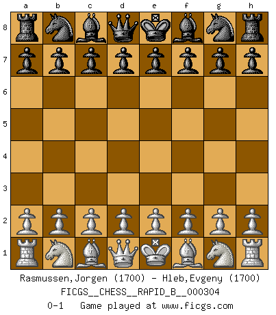 Last move : 0-1 2018 December 22 2:24:26 [Event "FICGS__CHESS__RAPID_B__000304"] [Site "FICGS"] [Date "2018.11.21"] [Round "1"] [White "Rasmussen,Jorgen"] [Black "Hleb,Evgeny"] [Result "0-1"] [WhiteElo "1700"] [BlackElo "1700"] 0-1 This chess game has been lost on time (started : 2018.11.21 21:42:7) Player Black won this chess game. Follow this game move after move (download)Chess, like any creative activity, can exist only through the combined efforts of those who have creative talent, and those who have the ability to organize their creative work. (Mikhail Botvinnik) Nicht daß Diemer aus Opportunismus Mitglied der NSDAP geworden wäre. Er war ein Fanatiker, in allem, was er tat. (Hans Ree) La mitad de las variaciones que son calculadas en una partida de torneo, resultan ser completamente superfluas. Desafortunadamente, nadie sabe por adelantado cual mitad. (Jan Tinman) La tactique, c'est ce que vous faites quand il y a quelque chose à faire; la stratégie, c'est ce que vous faites quand il n'y a rien à faire. (Savielli Tartacower) Horse racing is animated roulette. (Roger Kahn)