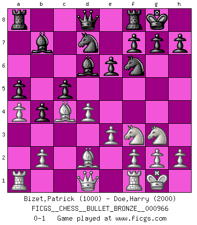 Last move : 0-1 2018 November 21 22:40:28 [Event "FICGS__CHESS__BULLET_BRONZE__000966"] [Site "FICGS"] [Date "2018.11.21"] [Round "1"] [White "Bizet,Patrick"] [Black "Doe,Harry"] [Result "0-1"] [WhiteElo "1000"] [BlackElo "2000"] 1.Nf3 Nf6 2.d4 d5 3.c4 c6 4.Nc3 dxc4 5.e3 b5 6.a4 b4 7.Na2 e6 8.Bxc4 Bb7 9.Bd2 a5 10.Nc1 Nbd7 11.Ne2 Bd6 12.Ng3 c5 13.O-O O-O 0-1 This chess game has been lost on time (started : 2018.11.21 22:13:16) Reti Opening Kingside Castling by player White (move 13) Kingside Castling by player Black (move 13) Player Black won this chess game. Follow this game move after move (download)A thorough understanding of the typical mating continuations makes the most complicated sacrificial combinations leading up to them not only not difficult, but almost a matter of course. (Siegbert Tarrasch) Charakterschwächen offenbaren sich normalerweise während einer Schachpartie. (Garry Kasparov) El Ajedrez es un cuento de Hadas de las 1001 metidas de pata. (Savielly Tartakower) Les Echecs représentent une sphère d'idées créatrices basée sur la volonté des deux protagonistes. (Smyslov) Industry executives and analysts often mistakenly talk about strategy as if it were some kind of chess match. But in chess, you have just two opponents, each with identical resources, and with luck playing a minimal role. The real world is much more like a poker game, with multiple players trying to make the best of whatever hand fortune has dealt them. In our industry, Bill Gates owns the table until someone proves otherwise. (David Moschella, 'Computerworld')