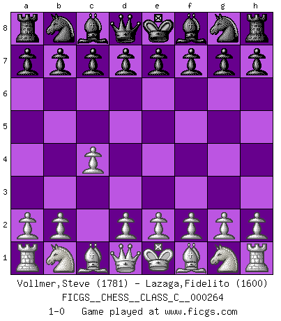 Last move : 1-0 2019 January 1 15:50:54 [Event "FICGS__CHESS__CLASS_C__000264"] [Site "FICGS"] [Date "2018.11.22"] [Round "1"] [White "Vollmer,Steve"] [Black "Lazaga,Fidelito"] [Result "1-0"] [WhiteElo "1781"] [BlackElo "1600"] 1.c4 1-0 This chess game has been lost on time (started : 2018.11.22 5:13:8) English Opening Player White won this chess game. Follow this game move after move (download)What is the object of playing a gambit opening?... To acquire a reputation of being a dashing player at the cost of losing a game. (Siegbert Tarrasch) Es liegt in der Natur, vernüftig zu denken und unlogisch zu handeln. (Anatole France) La mitad de las variaciones que son calculadas en una partida de torneo, resultan ser completamente superfluas. Desafortunadamente, nadie sabe por adelantado cual mitad. (Jan Tinman) La tactique est l'élément le plus important du milieu de jeu. (Siegbert Tarrasch) The best weapon against an enemy is another enemy. (Friedrich Nietzsche)