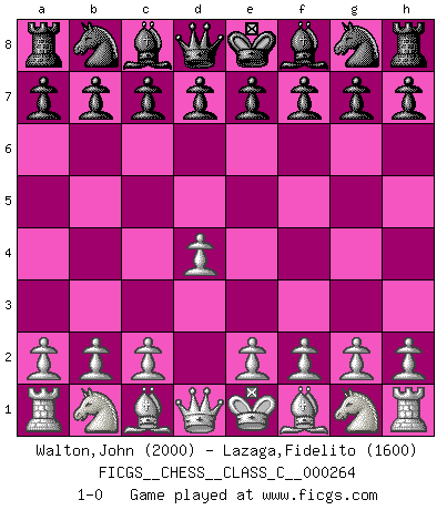 Last move : 1-0 2019 January 1 15:50:54 [Event "FICGS__CHESS__CLASS_C__000264"] [Site "FICGS"] [Date "2018.11.22"] [Round "1"] [White "Walton,John"] [Black "Lazaga,Fidelito"] [Result "1-0"] [WhiteElo "2000"] [BlackElo "1600"] 1.d4 1-0 This chess game has been lost on time (started : 2018.11.22 5:13:8) Queen's pawn Player White won this chess game. Follow this game move after move (download)It began to feel as though you were playing against Chess itself. - On playing against Robert Fischer. (Walter Shipman) Ich habe die Schachforschung dermaßen betrieben, dass sie auf eine wissenschaftliche Basis gestellt wurde. (Mikhail Moiseyevich Botvinik) El hombre es un frívolo, una creatura engañosa y como un jugador de Ajedrez, se preocupa mas por el proceso de obtener su meta que de la meta por sí misma. (Dostoyevsky) Des idées, des idées, j'en ai cent, j'en ai mille. Des bonnes, des mauvaises, applicables, irréalisables... Il suffit de faire le tri ! (Roos) A mistake is only a mistake if you let it happen twice. Otherwise it is a learning experience. (Daniel Parmet)