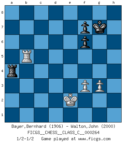 Last move : 1/2-1/2 2019 February 24 21:1:42 [Event "FICGS__CHESS__CLASS_C__000264"] [Site "FICGS"] [Date "2018.11.22"] [Round "1"] [White "Bayer,Bernhard"] [Black "Walton,John"] [Result "1/2-1/2"] [WhiteElo "1906"] [BlackElo "2000"] 1.e4 c5 2.Nf3 Nc6 3.Bb5 Nd4 4.Nxd4 cxd4 5.c3 a6 6.Ba4 Nf6 7.e5 Nd5 8.cxd4 Qb6 9.O-O Qxd4 10.Nc3 Nxc3 11.bxc3 Qxe5 12.Re1 Qf6 13.d4 e6 14.Rb1 b5 15.Bc2 d5 16.a4 Bd7 17.g3 Qd8 18.Qg4 h5 19.Qf3 Be7 20.axb5 axb5 21.Bd3 h4 22.Bf4 Rc8 23.Rb3 hxg3 24.hxg3 Bg5 25.Be5 Bf6 26.Qxd5 Kf8 27.Bxf6 gxf6 28.Qf3 Bc6 29.Be4 Bxe4 30.Qxe4 Rh5 31.Qb7 Rc7 32.Qf3 Rf5 33.Qe4 Qd5 34.Qxd5 Rxd5 35.Ra1 Kg7 36.Ra5 Rc4 37.Kf1 e5 38.dxe5 Rxe5 39.R3xb5 Rxb5 40.Rxb5 Rxc3 41.Ke2 Rc4 42.f3 Ra4 1/2-1/2 Sicilian : Nimzovich-Rossolimo attack (without ...d6) Kingside Castling by player White (move 9) 10 pieces endgame at move 39 : White KRPPP , Black KRRPP WHITE : King + 1 Rook 3 Pawns BLACK : King + 2 Rooks 2 Pawns 9 pieces endgame at move 40 : White KRPPP , Black KRPP WHITE : King + 1 Rook 3 Pawns BLACK : King + 1 Rook 2 Pawns 8 pieces endgame at move 40 : White KRPP , Black KRPP WHITE : King + 1 Rook 2 Pawns BLACK : King + 1 Rook 2 Pawns This chess game ended in a draw. Follow this game move after move (download)Chess, like love, like music, has the power to make people happy. (Siegbert Tarrasch) Man braucht nicht immer den besten Zug zu spielen: Ein Zug muß aktiv, unternehmungslustig, korrekt und schön sein. (David Bronstein) El Ajedrez lo es todo: arte, ciencia y deporte. (Anatoly Karpov) La tactique, c'est ce que vous faites quand il y a quelque chose à faire; la stratégie, c'est ce que vous faites quand il n'y a rien à faire. (Savielli Tartacower) Chess is as much a mystery as women. (Purdy)