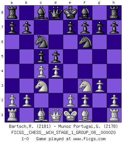 Last move : 1-0 2018 December 30 15:44:7 [Event "FICGS__CHESS__WCH_STAGE_1_GROUP_08__000020"] [Site "FICGS"] [Date "2018.11.23"] [Round "1"] [White "Bartsch,Reinhard Andrea"] [Black "Munoz Portugal,Guillermo"] [Result "1-0"] [WhiteElo "2181"] [BlackElo "2178"] 1.c4 c5 2.Nf3 Nc6 3.Nc3 Nf6 4.g3 d5 5.d4 1-0 This chess game has been lost on time (started : 2018.11.23 19:5:50) English : Symmetrical variation Player White won this chess game. Follow this game move after move (download)I still hope to kill Fischer. (Boris Spassky) Im Spitzenschach von heute geht es nur um Vorbereitung, um tiefgründige, sorgfältige Eröffnungsvorbereitung. (Nigel Short) El Ajedrez tiene tanto misterio como las mujeres. (Purdy) Karpov est une pièce de musée. (Garry Kasparov) Remember : Your focus determines your reality. (Qui-Gon Jinn in Star Wars ep.1)