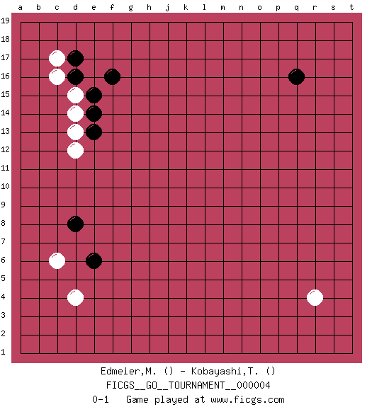 Last move : 0-1 2006 July 24 2:42:25 [Event "FICGS__GO__TOURNAMENT__000004"] [Site "FICGS"] [Date "2006.06.08"] [Round "1"] [Black "Edmeier,Michael"] [White "Kobayashi,Tetsuya"] [Result "0-1"] 1.d17 d4 2.q16 r4 3.e6 c6 4.d8 d15 5.f16 c17 6.d16 c16 7.e15 d14 8.e14 d13 9.e13 d12 0-1 This go game has been lost on time (started : 2006.06.08 14:53:11) Here are the names of the openings (joseki) played in the four corners : Corner d4 : d4 e6 Hoshi (Hwajeom, Seongjeom, Xingwei`) 4-4 Point. The star or hoshi (4-4) point, emphasizing influence at the potential expense of territory. Corner d16 : d17 d15 Komoku (Somok, Xiao~mu`) 3-4 Point. The komoku (3-4) point is the traditional corner enclosure move.. Ikken Takagakari (Hankan Nop'dakeolch'im, Yi Gaogua`jiao~, 1-Space High Approach). The 5-4 approach move has become more popular in modern times, as modern Go emphasizes speed and influence. Player White won this Go (weiqi, baduk) game. Follow this game move after move (download)Atari, atari is vulgar play. (Anonymous) 'preceded by its own quotation yields a falsehood' preceded by its own quotation yields a falsehood. (W. V. O. Quine - Set Theory And Its Logic, 1953)