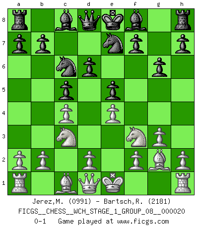 Last move : 0-1 2019 January 4 4:9:36 [Event "FICGS__CHESS__WCH_STAGE_1_GROUP_08__000020"] [Site "FICGS"] [Date "2018.11.23"] [Round "1"] [White "Jerez,Miriam"] [Black "Bartsch,Reinhard Andrea"] [Result "0-1"] [WhiteElo "0991"] [BlackElo "2181"] 1.e4 c5 2.Nf3 d6 3.c4 e5 4.Nc3 Nc6 5.g3 g6 6.Bg2 Nge7 0-1 This chess game has been lost on time (started : 2018.11.23 19:5:50) Sicilian Player Black won this chess game. Follow this game move after move (download)Fischer is an American Chess tragedy on par with Morphy and Pillsbury. (Mig Greengard) Je älter ich werde, um so mehr schätze ich die Bauern. (Paul Keres) El poder defensivo de una pieza clavada, solamente es imaginario. (Aaron Nimzovich) Nous vivons dans un monde échiquéen : chaque jour qui passe est un défi à relever. (Philosophe Sasha) Art is the triumph over chaos. (John Cheever)