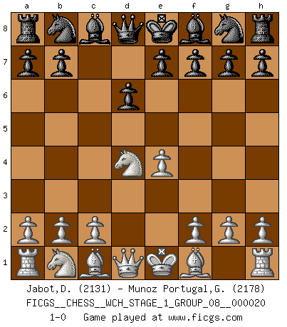 Last move : 1-0 2018 December 29 15:37:57 [Event "FICGS__CHESS__WCH_STAGE_1_GROUP_08__000020"] [Site "FICGS"] [Date "2018.11.23"] [Round "1"] [White "Jabot,Daniel"] [Black "Munoz Portugal,Guillermo"] [Result "1-0"] [WhiteElo "2131"] [BlackElo "2178"] 1.e4 c5 2.Nf3 d6 3.d4 cxd4 4.Nxd4 1-0 This chess game has been lost on time (started : 2018.11.23 19:5:50) Sicilian Player White won this chess game. Follow this game move after move (download)Chess is a foolish expedient for making idle people believe they are doing something very clever when they are only wasting their time. (George Bernard Shaw) Du musst Deinen Gegner in einen tiefen dunklen Wald führen wo 2+2=5 ist und wo der Weg, der wieder hinausführt, nur breit genug für einen ist. (Mikhail Nekhemyevich Tal) Con el fin de mejorar tu juego, debes de estudiar los finales antes que todo, ya que mientras que los finales pueden ser estudiados y dominados por sí mismos, el juegomedio y la apertura deben de ser estudiados en relación con los finales. (José Raúl Capablanca) Les réformistes prétendent que les progrès de la théorie conduiront à la disparition des échecs, et qu'il faut, pour leur rendre vie, en remanier les règles. En réalité, qu'exprime cette affirmation? Le mépris de l'intuition, de l'imagination et de tous les autres éléments qui font des échecs un art. (Alexander Alekhine) Are you threatening me, Master Jedi ? (Chancellor Palpatine in Star Wars ep.3)