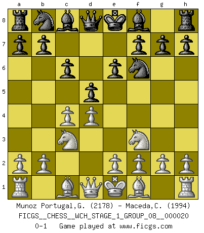 Last move : 0-1 2019 January 2 3:53:39 [Event "FICGS__CHESS__WCH_STAGE_1_GROUP_08__000020"] [Site "FICGS"] [Date "2018.11.23"] [Round "1"] [White "Munoz Portugal,Guillermo"] [Black "Maceda,Coco"] [Result "0-1"] [WhiteElo "2178"] [BlackElo "1994"] 1.d4 Nf6 2.c4 e6 3.Nc3 d5 4.Nf3 c6 0-1 This chess game has been lost on time (started : 2018.11.23 19:5:50) Queen's pawn game Player Black won this chess game. Follow this game move after move (download)Via the squares on the chessboard, the Indians explain the movement of time and the age, the higher influences which control the world and the ties which link Chess with the human soul. (Al-Masudi) Ein Teil des Fehlers ist immer korrekt. (Savielly Grigorievitsch Tartakower) Yo no creo en la psicología. Yo creo en las buenas movidas. (Bobby Fischer) Seul un grand joueur sait à quel point il joue faiblement. (Xavier Tartacover) Control your own destiny or someone else will. (Jack Welch)