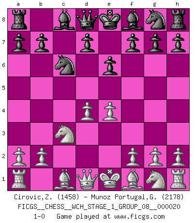 Last move : 1-0 2018 December 31 3:43:16 [Event "FICGS__CHESS__WCH_STAGE_1_GROUP_08__000020"] [Site "FICGS"] [Date "2018.11.23"] [Round "1"] [White "Cirovic,Zeljko"] [Black "Munoz Portugal,Guillermo"] [Result "1-0"] [WhiteElo "1458"] [BlackElo "2178"] 1.e4 c5 2.c3 Nc6 3.d4 cxd4 4.cxd4 e6 5.Nc3 1-0 This chess game has been lost on time (started : 2018.11.23 19:5:50) Sicilian : Alapin's variation (2.c3) Player White won this chess game. Follow this game move after move (download)Any material change in a position must come about by mate, a capture, or a Pawn promotion. (Purdy) Die Jungen erwarten, dass Opa einfach umfällt. Dann aber kann Opa fünf Stunden lang Schach spielen und die jungen Gegner an die Wand drücken. (Viktor Kortschnoi) Existen dos clases de sacrificios: los correctos y los míos. (Mikhail Tal) Ce qui est bien, c'est d'avoir tout un tas de pièces en prise : l'adversaire ne peut en prendre qu'une à la fois. Cité par Thierry Audin. Mandala - that's it! 16x16 squares as multiple of the four and the eight because of the Four Noble Truths and the Noble Eightfold Path. (Heinz-Georg Lehnhoff about Big Chess)
