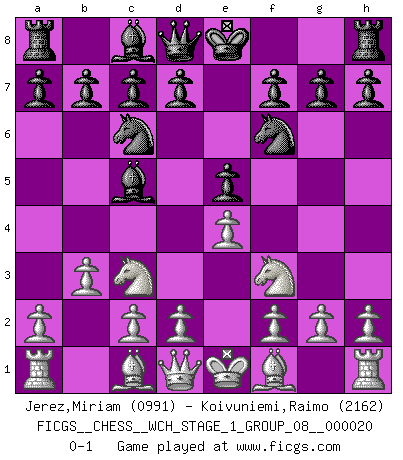 Last move : 0-1 2019 January 10 4:44:17 [Event "FICGS__CHESS__WCH_STAGE_1_GROUP_08__000020"] [Site "FICGS"] [Date "2018.11.23"] [Round "1"] [White "Jerez,Miriam"] [Black "Koivuniemi,Raimo"] [Result "0-1"] [WhiteElo "0991"] [BlackElo "2162"] 1.e4 e5 2.Nf3 Nf6 3.Nc3 Nc6 4.b3 Bc5 0-1 This chess game has been lost on time (started : 2018.11.23 19:5:50) Petrov Three knights game Player Black won this chess game. Follow this game move after move (download)The older I grow, the more I value pawns. (Paul Keres) Auf jeden Fall musst du zuerst Rechtsanwalt werden, damit du deine eigenen Interessen und die deiner Familie vertreten kannst. [Brief an seinen Sohn] (José Raúl Capablanca) La última cosa en que Fischer estaba interesado era en tonterías, siempre y cuando el Ajedrez estuviera involucrado. (Elie Agur) Karpov est une pièce de musée. (Garry Kasparov) Go and wake up your luck. (Persian saying)