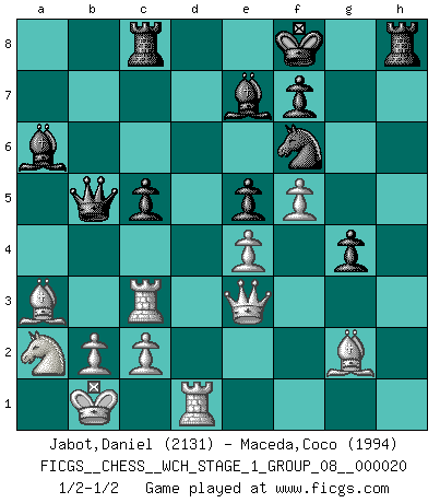 Last move : 1/2-1/2 2019 March 15 16:50:5 [Event "FICGS__CHESS__WCH_STAGE_1_GROUP_08__000020"] [Site "FICGS"] [Date "2018.11.23"] [Round "1"] [White "Jabot,Daniel"] [Black "Maceda,Coco"] [Result "1/2-1/2"] [WhiteElo "2131"] [BlackElo "1994"] 1.e4 c5 2.Nf3 d6 3.d4 cxd4 4.Nxd4 Nf6 5.Nc3 a6 6.Bg5 e6 7.f4 h6 8.Bh4 Qb6 9.a3 Be7 10.Bf2 Qc7 11.Qf3 Nbd7 12.O-O-O b5 13.g4 Bb7 14.Bg2 Rc8 15.Kb1 g5 16.h4 Rg8 17.hxg5 hxg5 18.f5 e5 19.Nb3 a5 20.Qe2 Bc6 21.Na2 Bb7 22.Rh3 b4 23.axb4 axb4 24.Be1 Nxg4 25.Bxb4 Ngf6 26.Na5 Ba6 27.Qd2 g4 28.Rc3 Nc5 29.Qe1 Rh8 30.Nb3 Qb6 31.Nxc5 dxc5 32.Ba3 Kf8 33.Qg3 Qb8 34.Qe3 Qb5 35.Rb3 Qc6 36.Rc3 Qb5 37.Nc1 Qc6 38.Na2 Qb5 1/2-1/2 Sicilian : Najdorf, 7.f4 Queenside Castling by player White (move 12) This chess game ended in a draw. Follow this game move after move (download)There are two types of sacrifices: correct ones and mine. (Mikhail Tal) Wie gewinnt Tal? Er entwickelt alle seine Figuren in die Brettmitte und opfert sie dann irgendwo. (Robert James Fischer) No volvere nunca a jugar contigo. Has insultado a mi amigo. - cuando un oponente se maldijo por una mala jugada (Miguel Najdorf) Je menace de comprendre la position. (Anonyme) Perhaps the current trend of many chess professionals taking up the more lucrative pastime of poker is not a wholly negative one. It may not be too late for humans to relearn how to take risks in order to innovate and thereby maintain the advanced lifestyles we enjoy. And if it takes a poker-playing supercomputer to remind us that we can't enjoy the rewards without taking the risks, so be it. (The Chess Master and the Computer, by Garry Kasparov - 2010)
